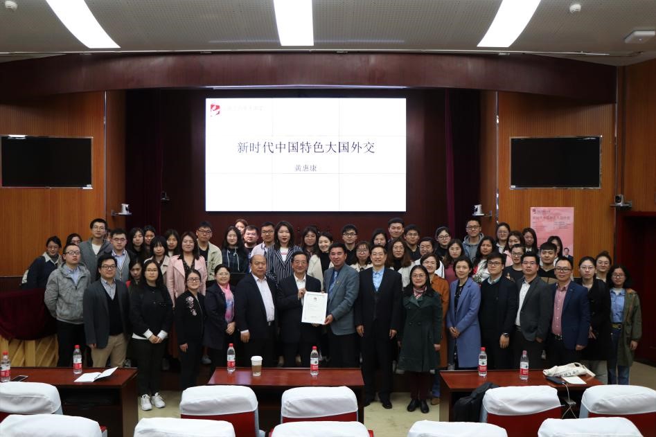 黄惠康大使以生动形象的语言讲述了我国“四位一体”的外交格局,通过“绿色外交”“蓝色外交”“红色外交”“数字外交”介绍新时代中国外交的新疆域,通过讲述“外交事、外交人、外交魂”介绍了中国外交人的无私奉献以及“忠诚,使命,奉献”的使命担当。