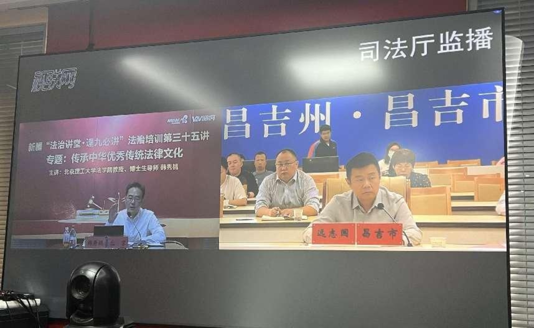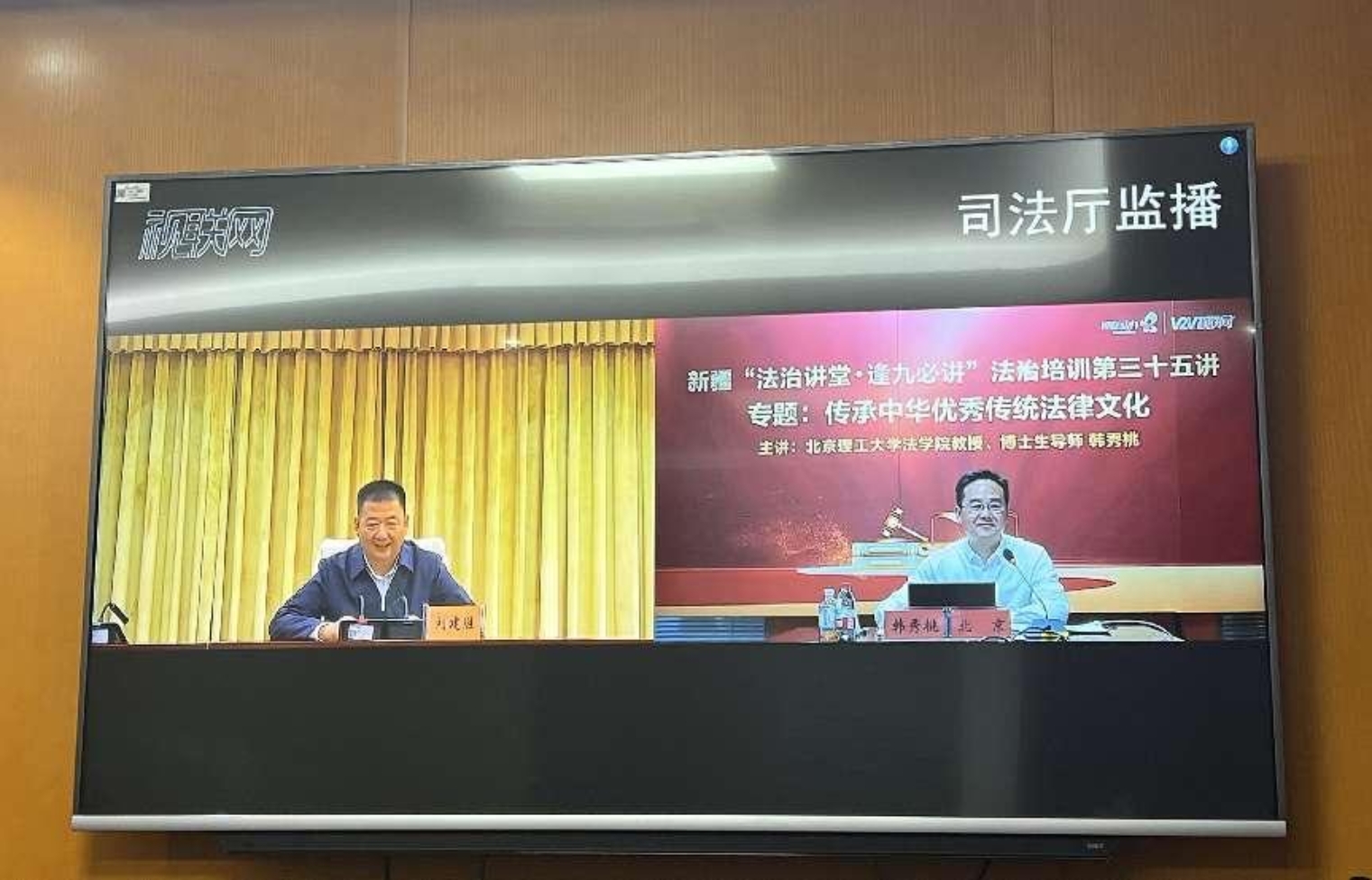 新疆维吾尔自治区党委全面依法治疆委员会办公室副主任,自治区司法厅党委书记、副厅长刘建胜主持讲座。讲座在北京设演播厅,自治区司法厅设主会场,自治区厅直机关各部门和各市州、县有关部门共设有1903个分会场,全疆5.3万多人同上一堂课。
