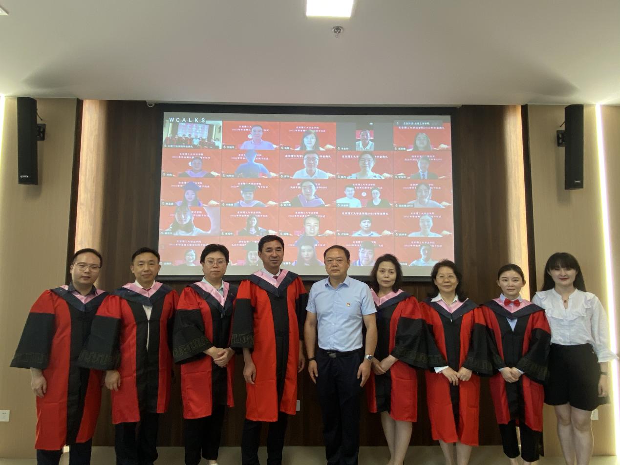 在毕业生学位授予环节,院长李寿平教授邀请教授委员会成员韩君玲、龚向前、齐延平、赵秀梅、胡晓霞共同为毕业生拨穗。拨穗仪式结束,老师与同学们,线上线下合影留念,把美好的时刻永远定格。