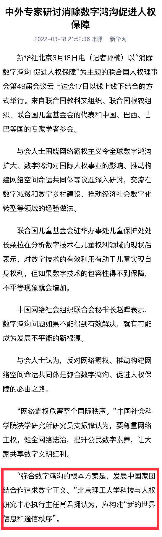 与会人士认为,反对网络霸权、推动构建网络空间命运共同体是弥合数字鸿沟、促进人权保障的必由之路。