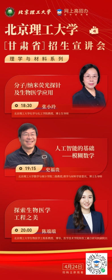 4月24日晚,甘肃招生组继续举办“理学与材料大类专业”专场宣讲会。化学与化工学院教授张小玲、数学与统计学院教授史福贵、生物医学工程系教授陈端端、甘肃招生组马晓龙共同通过网上高招办平台与考生和家长见面和答疑,约6000名家长、考生在线观看。