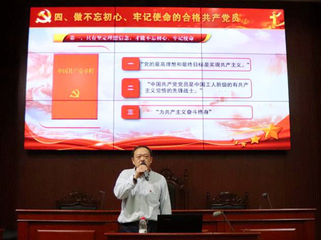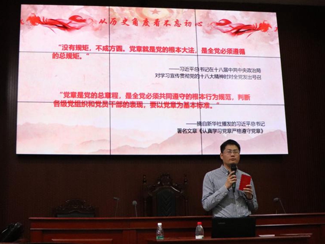 第三讲是周明宇讲授的“不忘初心 做合格党员”专题讲座。他的讲座分为从历史角度看不忘初心和不忘初心、做合格的学生党员两个部分。周明宇首先引用习近平总书记的讲话“没有规矩,不成方圆。党章就是党的根本大法,是全党必须遵循的总规矩”和署名文章里的内容“党章是党的总章程,是全党必须共同遵守的根本行为规范,判断各级党组织和党员干部的表现,要以党章为基本标准”,告诉同学们《中国共产党章程》的重要性,并从历史角度回顾了《中国共产党章程》的历次修正。接着周明宇告诉同学们每一名党员都在不同的岗位,从事不同的工作,因此,做一名合格的党员,必须是具体的而不是抽象的,必须通过一定的载体,最终,合格的党员也就要转化为不同的标准。之后周明宇从“讲政治、有信念”“讲规矩、有纪律”“讲道德、有品行”“讲奉献,有作为”四个方面提出了学生合格党员的标准,告诫学员们要政治合格、坚定信仰,守住底线、严格自律,知行合一、敢于担当,坚持学习、增强本领,给学员们在学校期间的学习提出了更高的要求,教导大家要以一名中国共产党党员的标准严格要求自己,争取早日加入中国共产党。