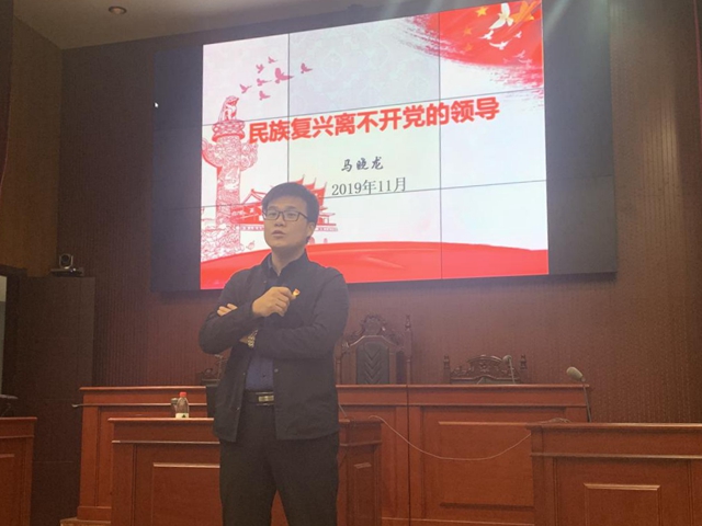 第二讲主题党课,马晓龙以“民族复兴离不开党的领导”为主题,为在座的同学们带来了一次深刻的爱国主义教育。他首先以中国共产党建国的来之不易,向同学们描述了第一批中国共产党人抛头颅洒热血,历经千辛万苦建立了新中国的奋斗场景,在结束了近代中国半殖民地半封建社会的屈辱历史,中国人民终于从此站起来了。马晓龙结合过往的历史和近代社会现状,让同学们明白了只有中国共产党能够真正整合中国人民的力量、只有中国共产党能够全面坚决的抗击外敌侵略、只有中国共产党才具有彻底清理本国发展阻碍的实力、只有中国共产党才能发展中国,是历史选择了中国共产党这一道理。之后又讲到了现代祖国的强大,在多次国际救援中保护华侨华人,谈到了国内社会以及人民的安全,指出实现民族复兴必须坚持中国共产党的领导。马晓龙生动幽默的讲述,让同学们明白了如今安定繁荣生活的来之不易,让同学们明白了要感恩中国共产党,感恩伟大的祖国。