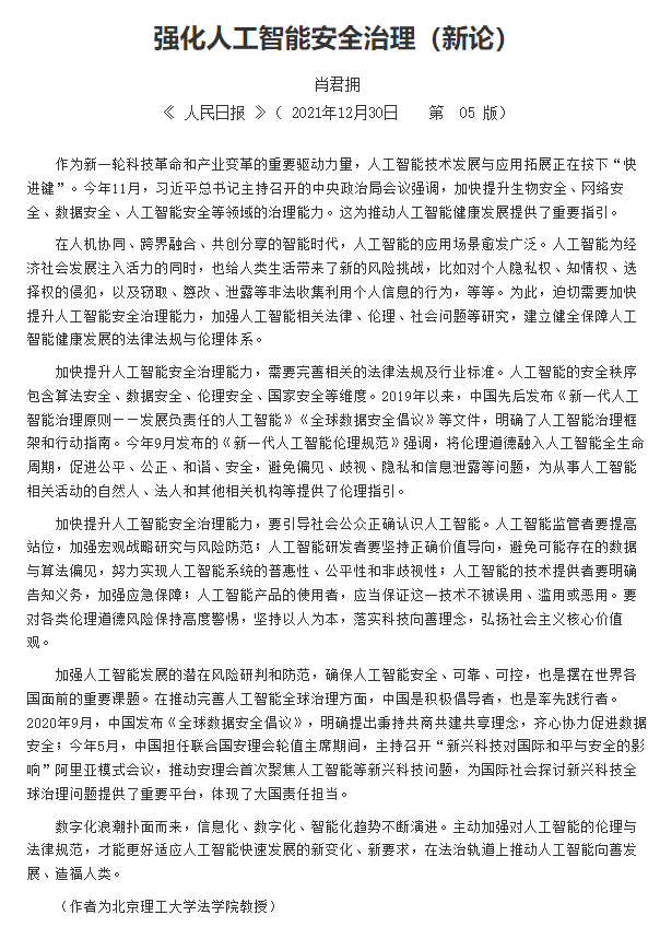 作为新一轮科技革命和产业变革的重要驱动力量,人工智能技术发展与应用拓展正在按下“快进键”。今年11月,习近平总书记主持召开的中央政治局会议强调,加快提升生物安全、网络安全、数据安全、人工智能安全等领域的治理能力。这为推动人工智能健康发展提供了重要指引。