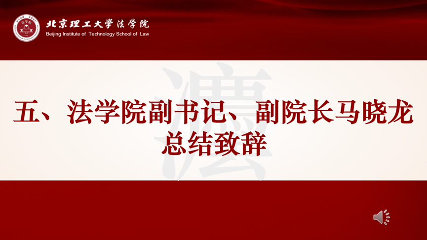 会议最后,由马晓龙做总结发言。他首先对研会和法援取得的工作成绩和学生们的辛苦付出表示肯定和鼓励,同时也指出了目前学生工作仍存在一些不足,强调学生工作要聚焦重点和难点。他提出,在今后的工作中要进一步提升学生工作的质感,将系列活动做成精品,并点明工作也要具有创新性,要举办更多特色活动。同时强调,学生工作要聚焦实践,学院鼓励学生工作与社会实践相结合,发挥出更大的社会效能。