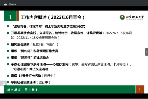 会议首先由研会各部门对上学期分管开展的各项具体工作进行汇报,部门间互相借鉴更加高效的工作分配与团队协作方式,并就工作中出现的沟通协调不畅、策划创新不足等一系列问题进行反思,提出解决办法。各部门汇报完毕后,朱峻豪同学从整体出发对研会上学期的工作情况进行了总结,梳理了过去一学期取得的工作成果,同时,对下学期研会的工作提出了新的要求和期望。