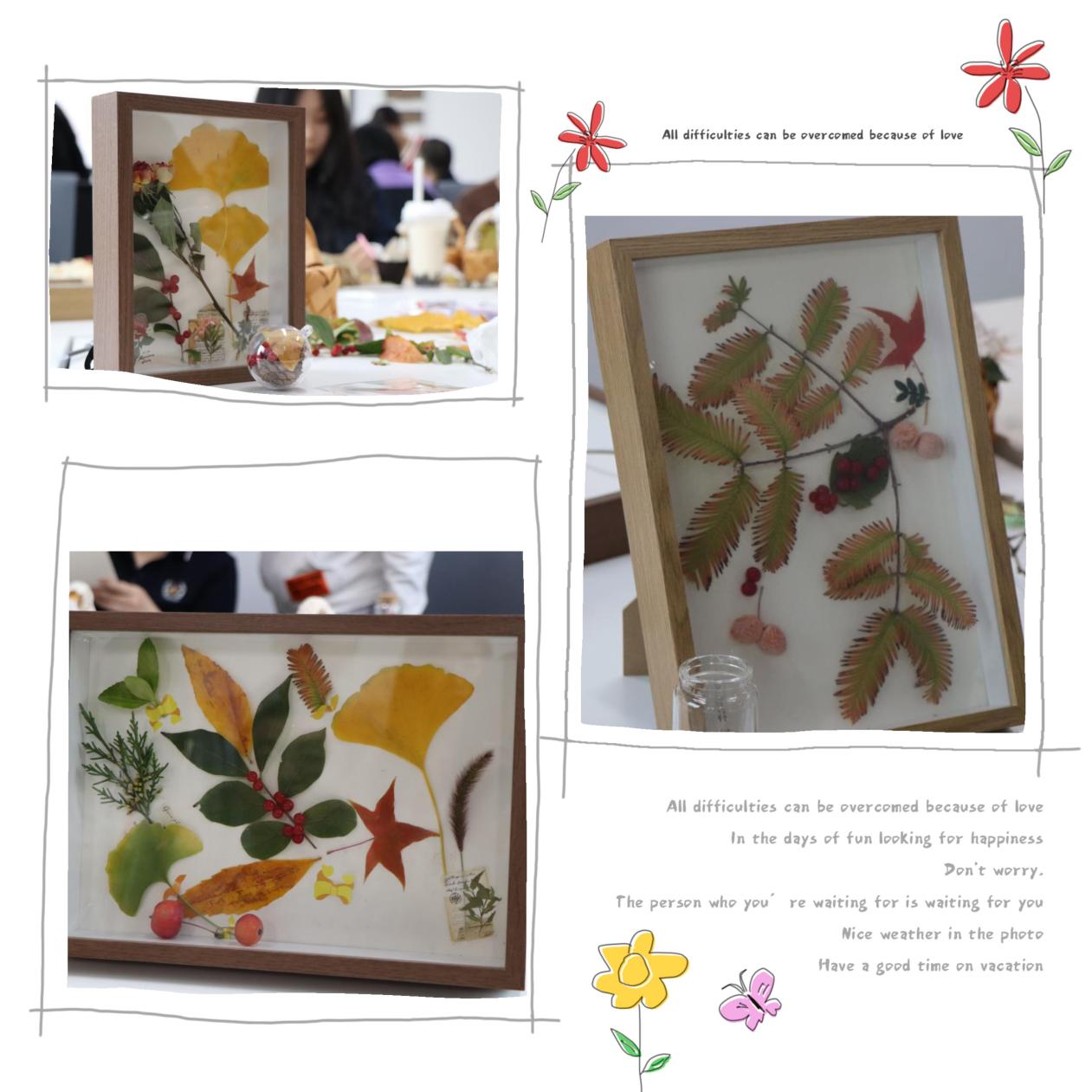 老师们利用收集到的树叶,果实和干花等,经过巧手拼图、粘贴、添画和文字,树叶正在他们的手中变成一幅幅美丽的画作,给斑斓的落叶赋予了新的生命。