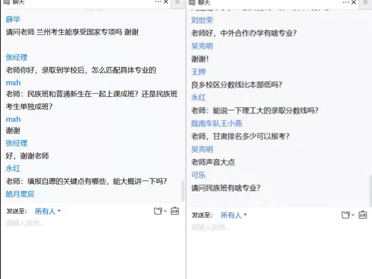 宣讲结束后,会议进入由马晓龙主持的答疑环节。两场会议中,马晓龙在记录各位老师、学生、家长在腾讯会议、微信公众号等处的留言的基础上,梳理成五十余问题,这些问题涉及单列招生、排名位次、少数民族班招生、专业分流、深造就业、校园环境等方面。马晓龙针对这些问题展开了详细的回应,补充了宣讲的未尽之处,释明了各位老师、学生和家长的疑惑。