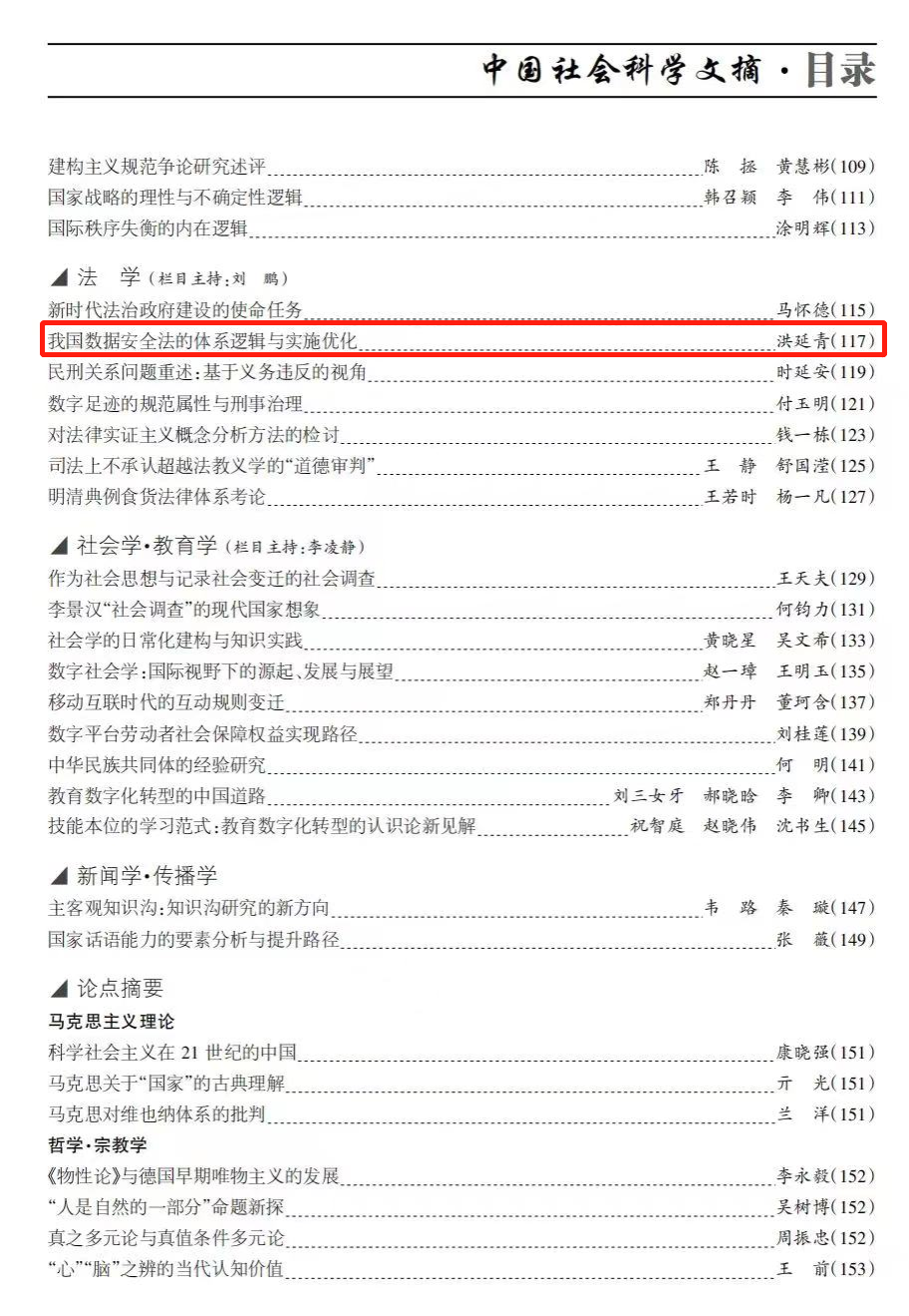 近日,永利14m在线登录官网教授洪延青所著论文《我国数据安全法的体系逻辑与实施优化》被《中国社会科学文摘》第七期转载,该文原载于《法学杂志》2023年2期。