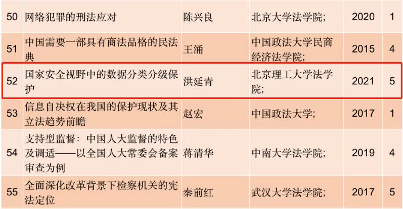 中国知网评价中心推出的产品《学术精要数据库》是支持代表作论文遴选、衡量学者研究成果影响力的评价参考工具。学术精要数据库对中国知网收录的近十年的论文数据进行统计,按“论文引证标准化指数”(PCSI)、被引频次、下载频次的高低分别遴选出前1%的高影响力论文。同时对被引频次各学科前10%的论文提供单篇文献评价报告,全面了解论文影响力的发展趋势及同行的引用评论内容。我院洪延青教授2021年在《中国法律评论》发表的《国家安全视野中的数据分类分级保护》一文,入选《学术精要数据库》“三高”论文,体现该文章的高影响力。