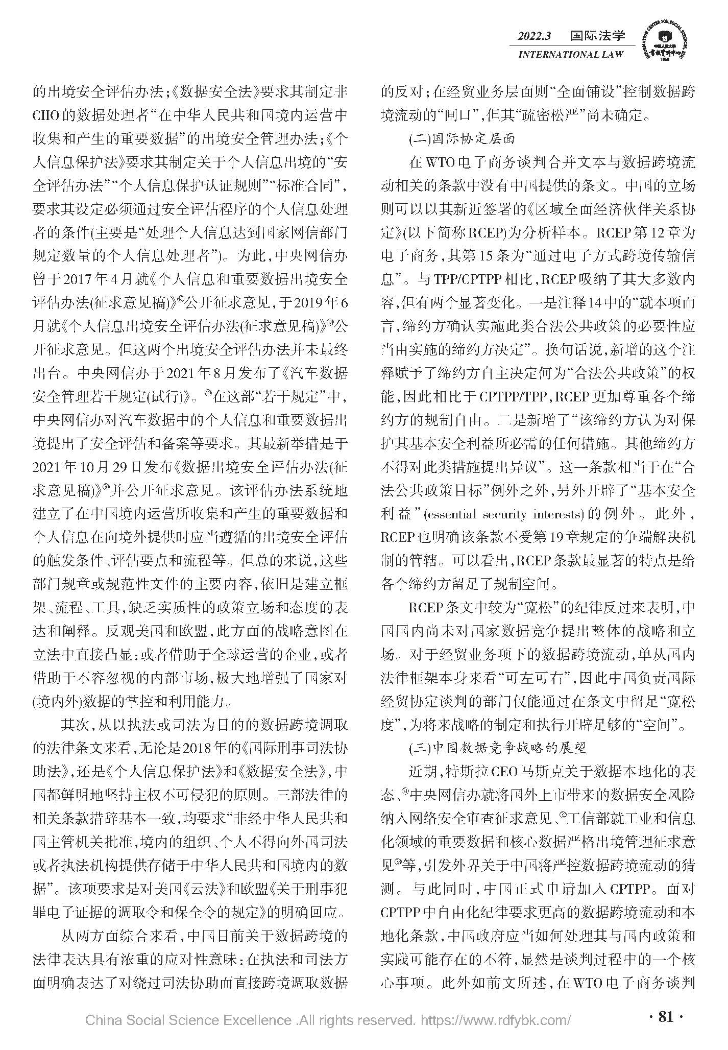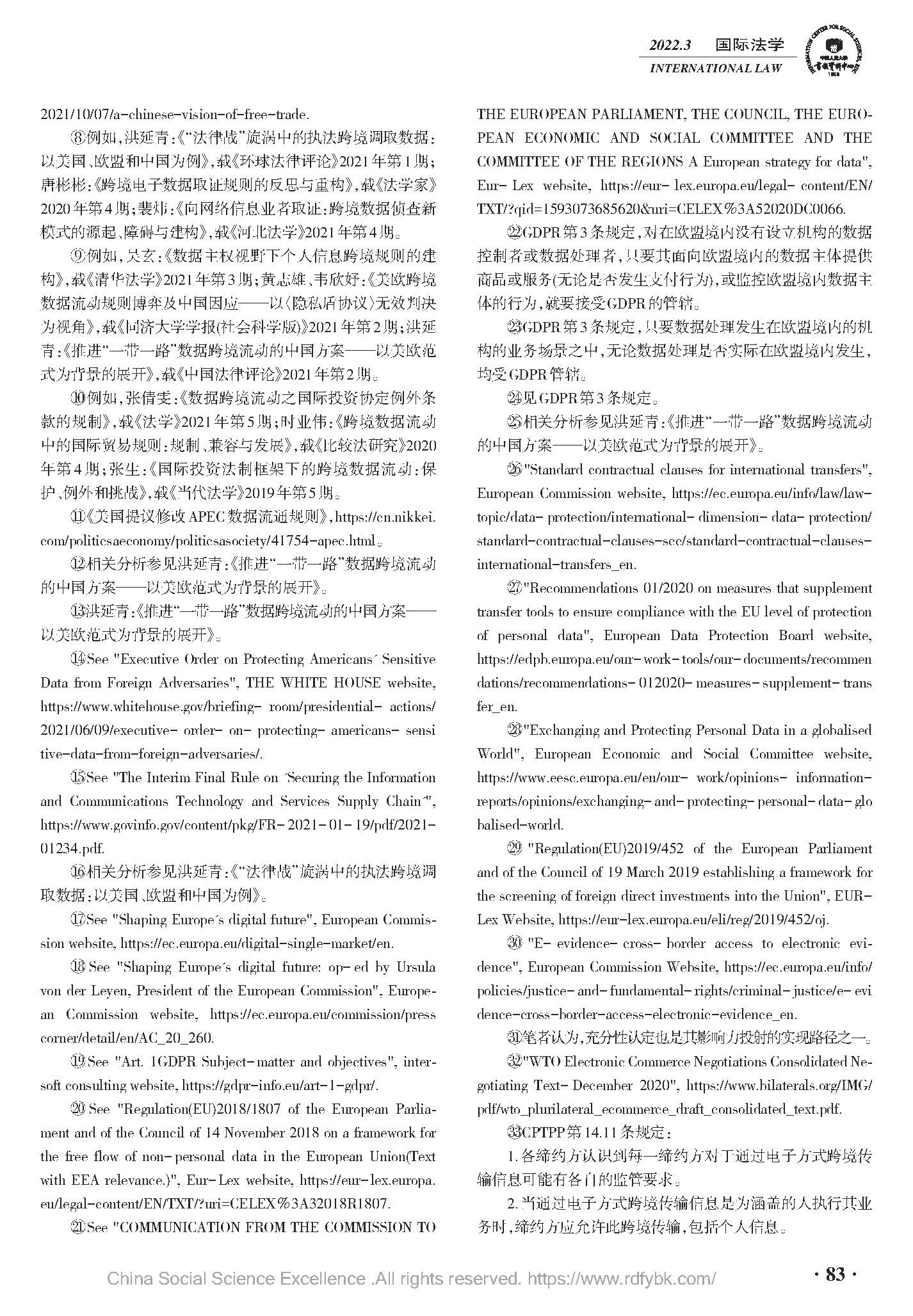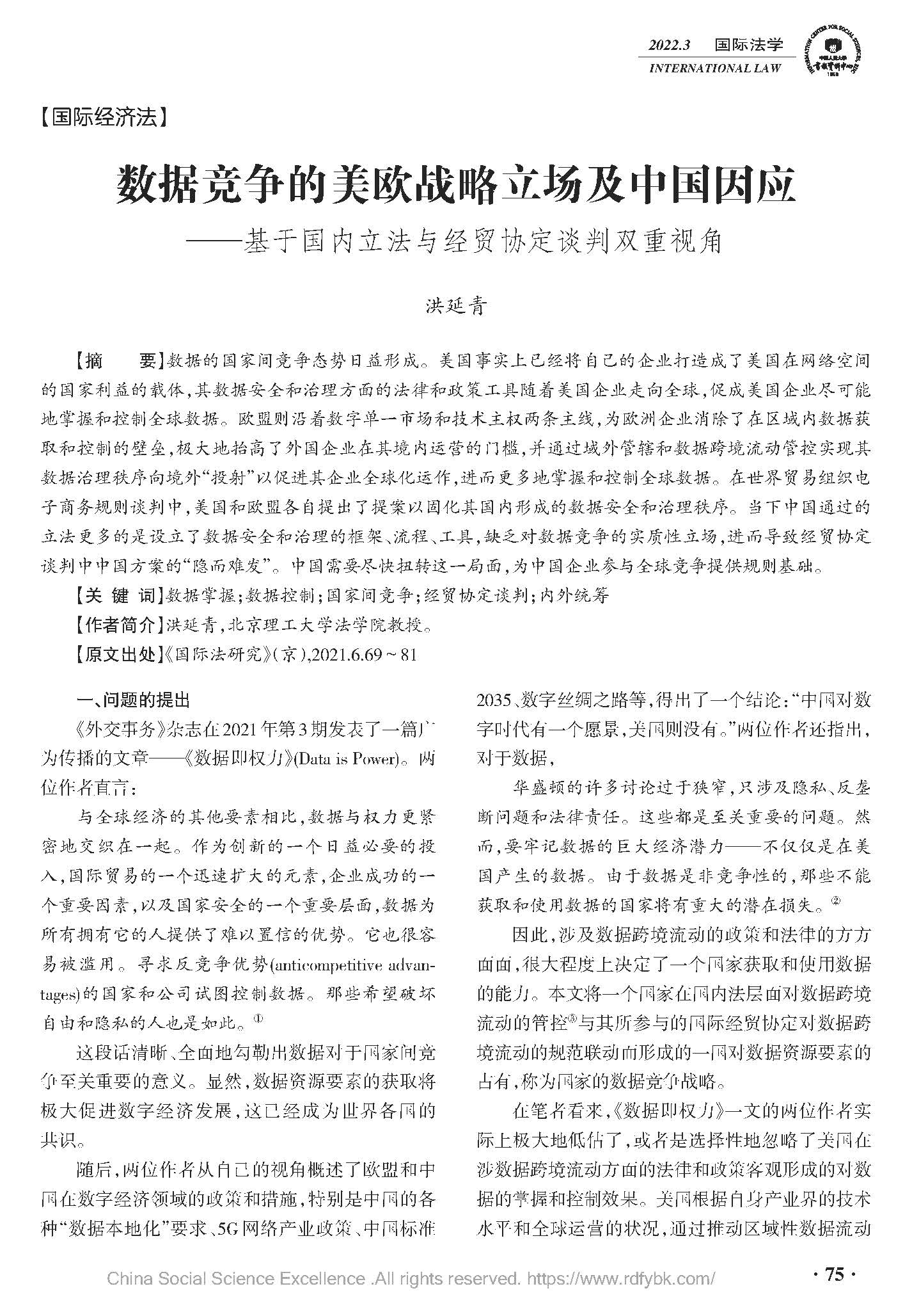 数据竞争的美欧战略立场及中国因应——基于国内立法与经贸协定谈判双重视角,中国人民大学复印报刊资料《国际法学》2022年03期全文转载。(原文载于《国际法研究》(京),2021.6.69~81)