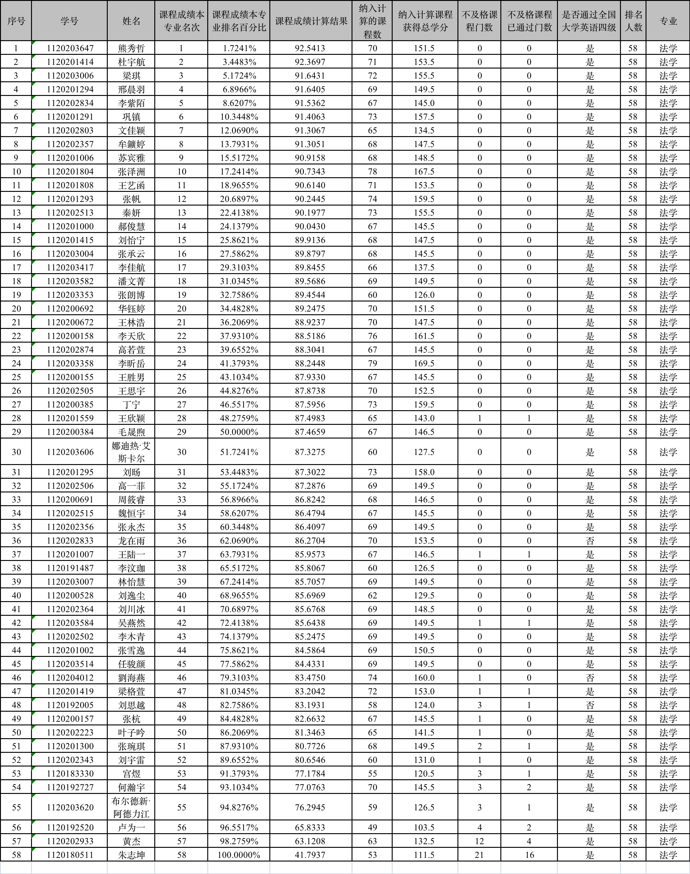 6.不及格课程门数:纳入计算的课程中不及格的课程门数,未达到学校对学生国家大学英语四级考试成绩的分数要求(<425分)不计入;