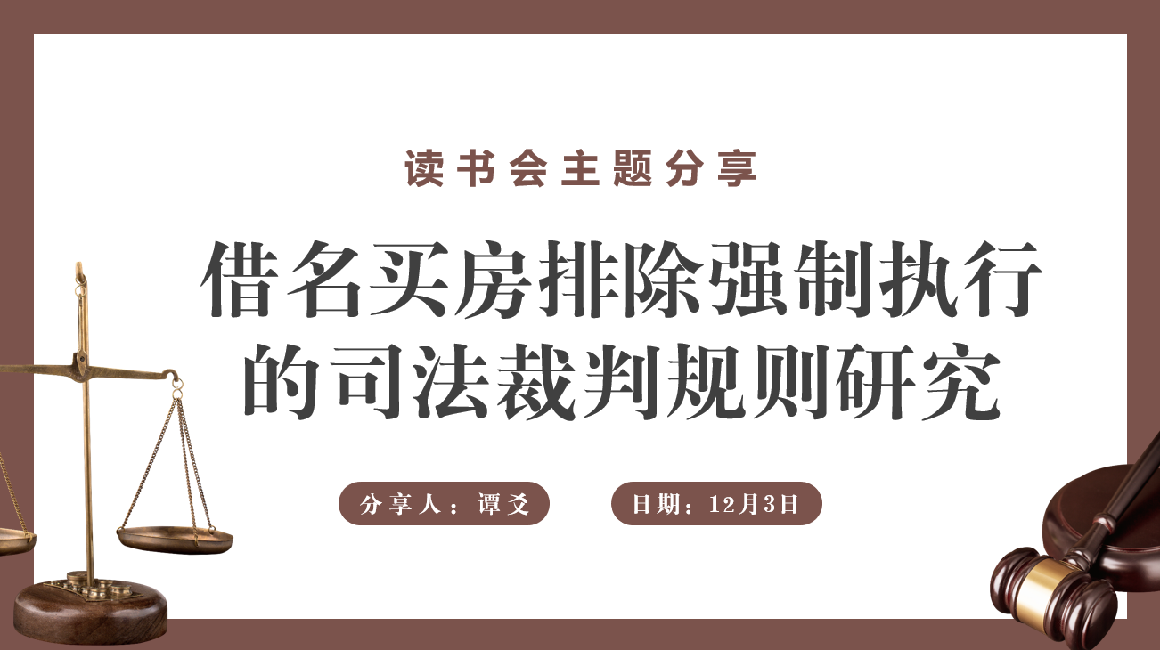 2023级法学硕士生谭爻同学就“借名买房”这一主题进行了知识分享,主要就“借名买房协议的有效性”“借名人享有的权利性质”以及“借名人是否具有足以排除强制执行民事权益”这几个重点法律问题进行分析。在“借名买房协议的有效性”这一问题中,谭爻同学深入分析了违反限购限贷政策借名买房、借名购买经济适用房等政策性保障住房和普通借名买房三种情况下借名买房协议的效力,认为在借名购买经济适用房等政策保障性住房时,借名买房合同应认定为无效。在借名人享有的权利类型这一问题中,谭爻同学综合司法判例对“物权说”与“债权说”的优劣进行对比,认为“债权说”是更适合当下司法实践现状的路径选择,并分享了借名人权利的“债权物权化”这一新颖观点,大家对此观点展开了深入剖析与激烈讨论。