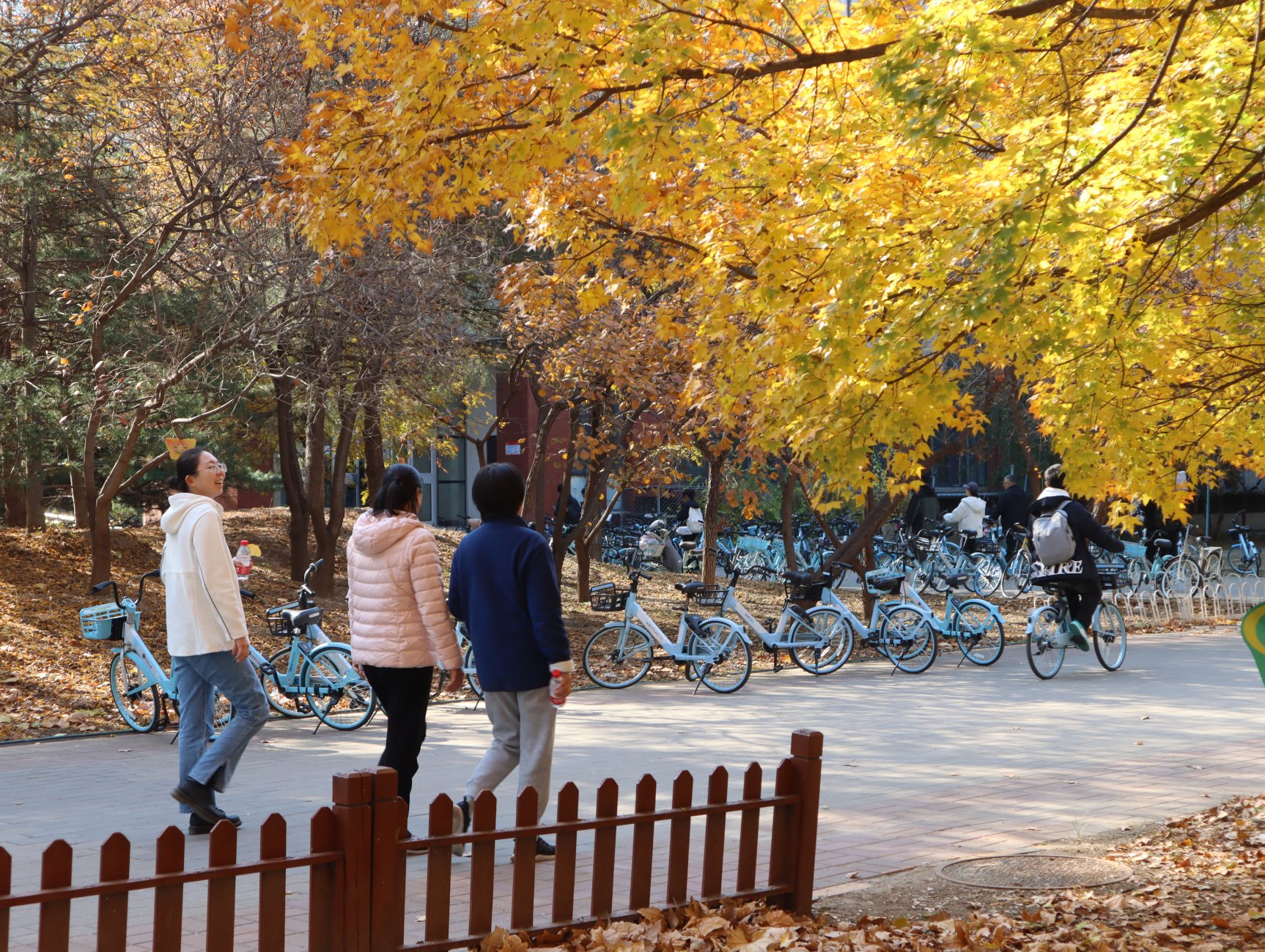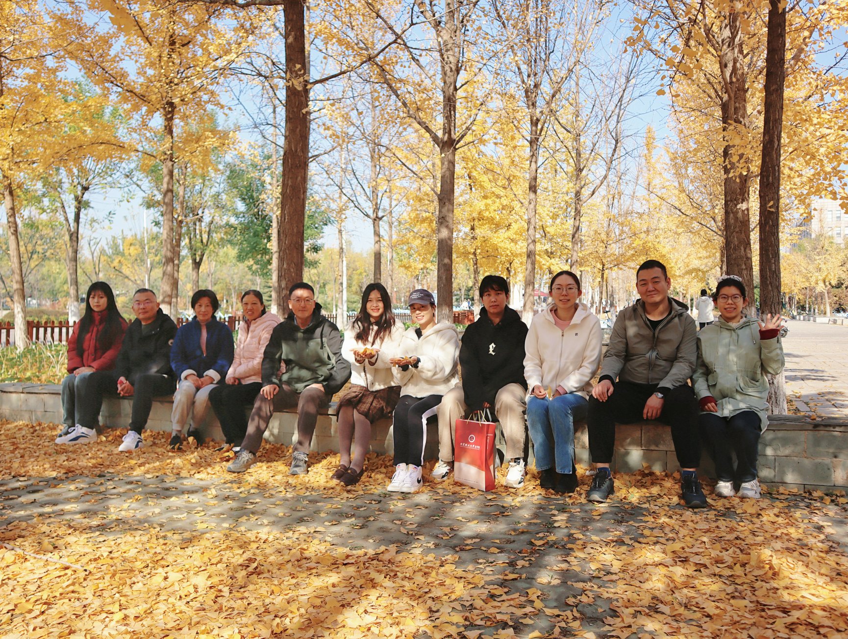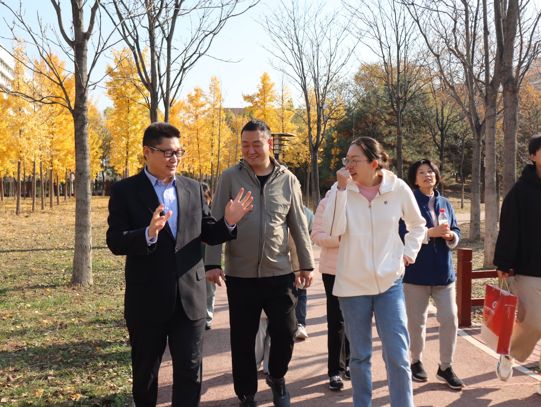 随后,教职工们继续前行,来到了南校区银杏林。这里金黄的银杏叶随风飘落,宛如一片金色的海洋。