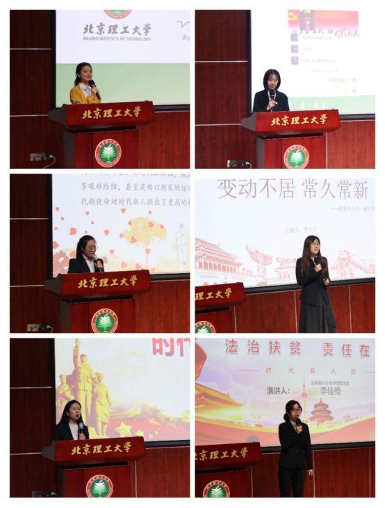 2020级硕士研究生李佳橙,她的演讲题目是《法治扶贫,责任在肩》。作为一名法科生,她谈到自己将勇于承担时代的使命,努力为成为法治扶贫工作先锋不懈奋斗。为了更好地参与法治扶贫工作,她将不断锤炼自身、积累知识,为今后的实践做好准备。
