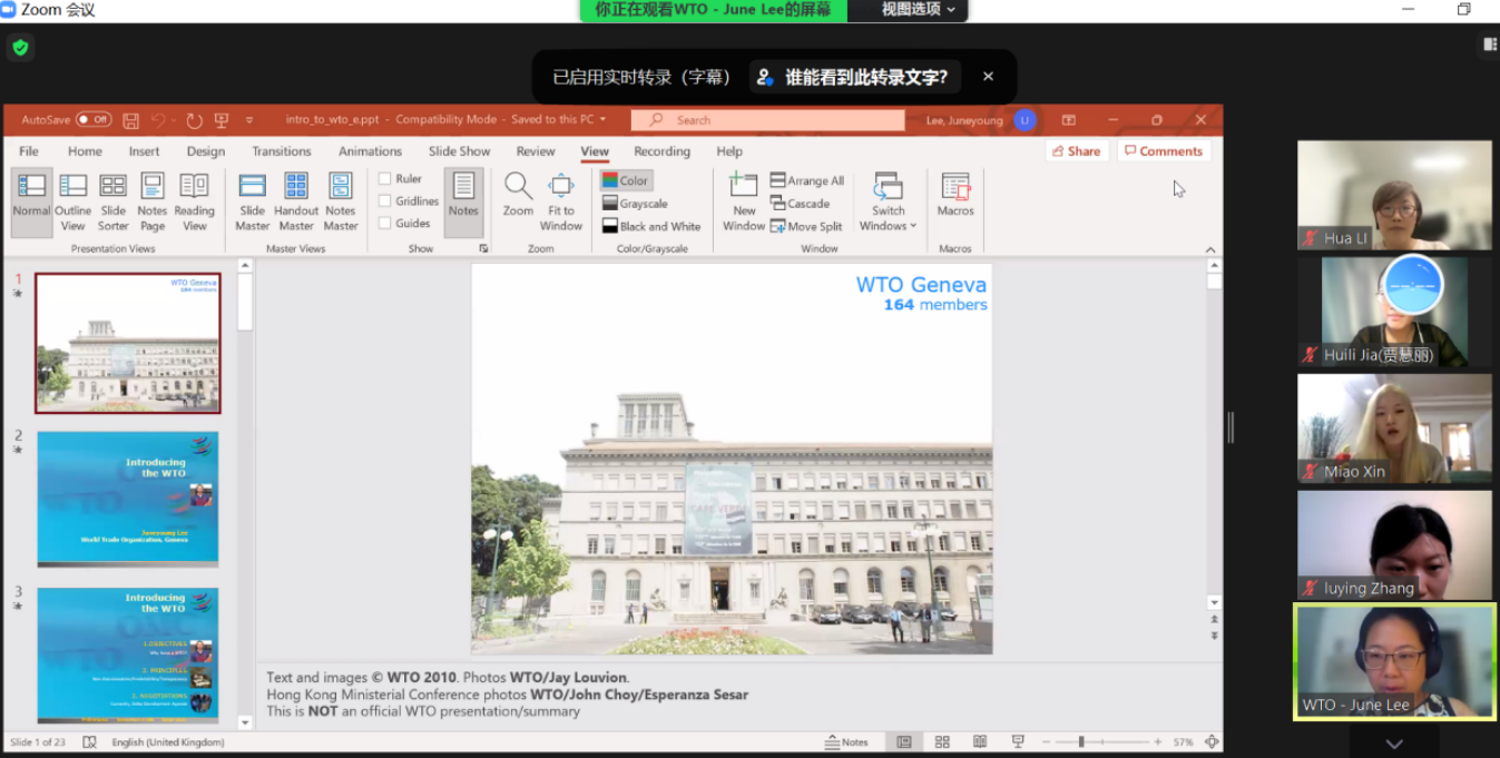 第二位受邀专家为李竣英(Juneyoung LEE), 她是WTO首席顾问/法律事务干事,作为贸易法和政策资深专家,拥有16年的经验为部长级官员/总统办公室提供政治复杂的国际和区域贸易以及“贸易与 ("trade and - ")”问题提供咨询。考虑到授课学生的背景多元化,她为学生们讲授了WTO的基本理论问题包括WTO的目标和作用、基本原则、WTO的作用以及WTO与环境的问题。