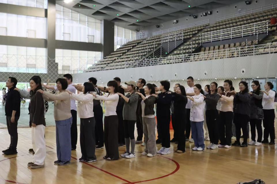 “团队热身”环节,教职工们开始热身。