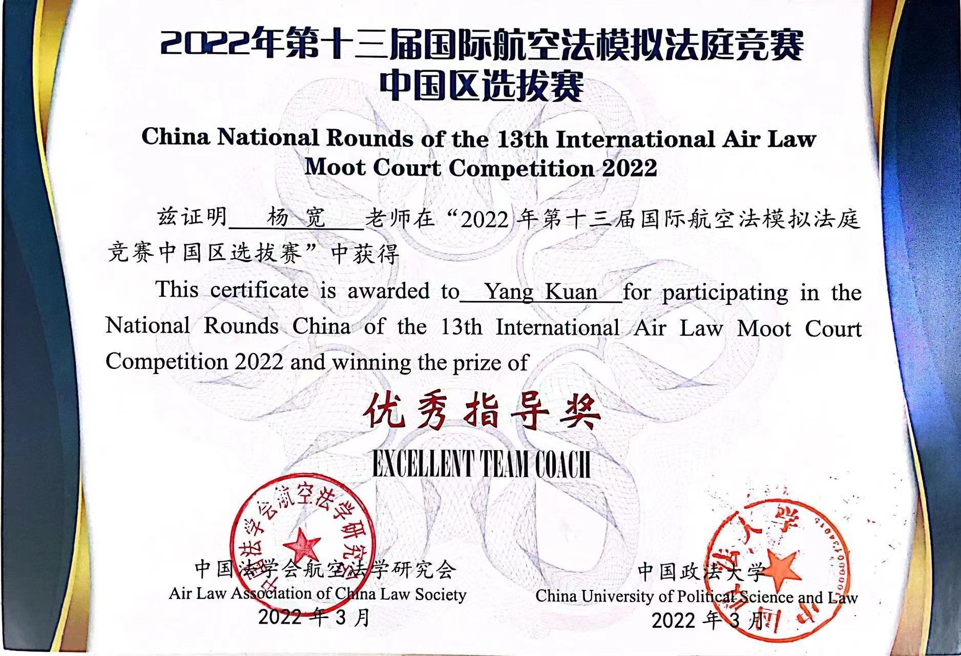 2022年3月,由中国法学会航空法学研究会、中国政法大学主办的第十三届“莱顿-塞琳”(Leiden-Sarin)国际航空法模拟法庭竞赛中国区选拔赛在北京举行,参赛队伍包括武汉大学、中国政法大学、华东政法大学、北京航空航天大学、中国民航大学等。经过两天激烈角逐,我校代表队荣获团体二等奖,永利14m在线登录官网杨宽老师获优秀指导奖。