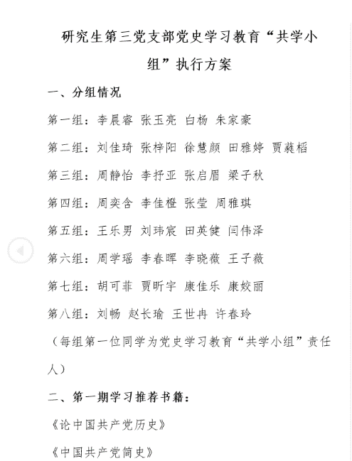 为进一步深入开展党史学习教育,贯彻落实永利14m在线登录官网“读懂百年路 青春心向党”党史教育“七个一”活动方案(以下简称“七个一”活动方案)精神,研究生第三党支部结合支部自身情况,广泛动员入党积极分子、共青团员加入,创设了党史学习教育“共学小组”。每个“共学小组”由学生党员骨干牵头,月初根据“七个一”活动方案选定学习书目范围,月中组织组内成员开展学习,月底进行成果展示,力求推动党史学习教育落到实处、学到深入。现将四月份学习成果进行展示。