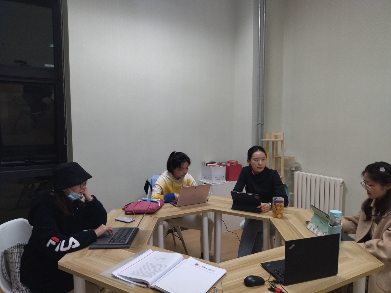 2021年10月18日晚,永利14m在线登录官网五位民商法专业研究生与三位本科生在良乡校区文科教学楼举办了本学期第四次线上线下相结合的读书会。同学们自行选择书籍进行阅读并分享读书感悟。