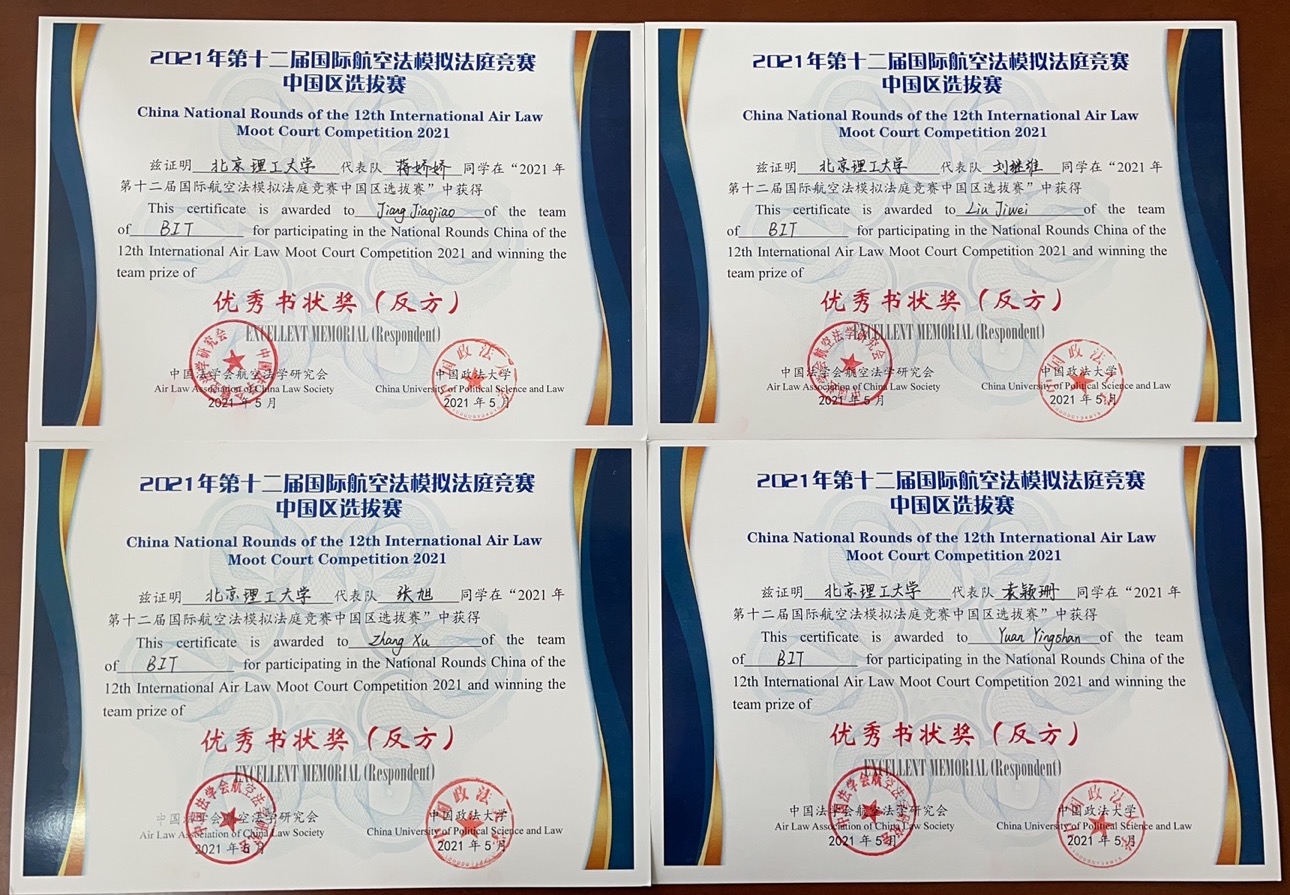 2021年4月,由中国法学会航空法学研究会、中国政法大学主办的第十二届“莱顿-塞琳”国际航空法模拟法庭竞赛中国赛在北京举行。此次竞赛以线上形式进行,永利14m在线登录官网、中国政法大学、北京航空航天大学、武汉大学、华东政法大学、中国民航大学、北方工业大学等高校代表队参与竞赛。经过两天激烈角逐,北理工代表队荣获竞赛三等奖、优秀书状奖(反方),永利14m在线登录官网杨宽老师荣获优秀指导奖。