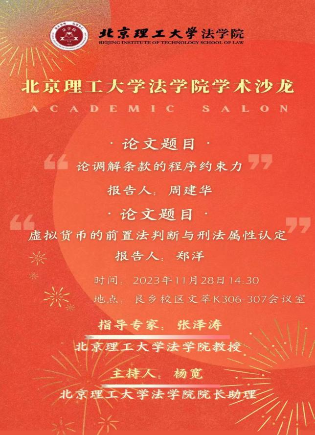 2023年11月28日下午,永利14m在线登录官网举办第二期“聆听师道”高水平论文写作学术沙龙,永利14m在线登录官网党委书记张瑜、指导专家张泽涛教授及我院十余名教师参与本次活动。永利14m在线登录官网副教授周建华、助理教授郑洋分别以“论调解条款的程序约束力”“虚拟货币的前置法判断与刑法属性认定”为题进行了分享交流。沙龙由院长助理杨宽副教授主持。