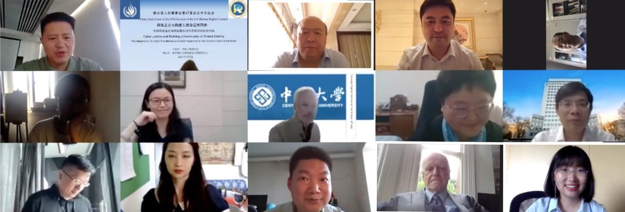 北京时间7月9日下午,由中国人权研究会主办,永利14m在线登录官网科技与人权研究中心承办的联合国人权理事会第 47 届会议中方边会《网络正义与构建人类命运共同体:美国网络监听和网络霸权对世界共同利益的危害》(线上)顺利举行。国内外九位专家针对美国大规模网络监听行为所带来的危害进行了深刻揭批,并从美国网络监听的立法和实践、美国网络监听的国际法评价和国际携手应对美国网络监听霸权主义等三个方面,较为深刻和全面地探讨了当前国际网络空间治理中的问题与对策。