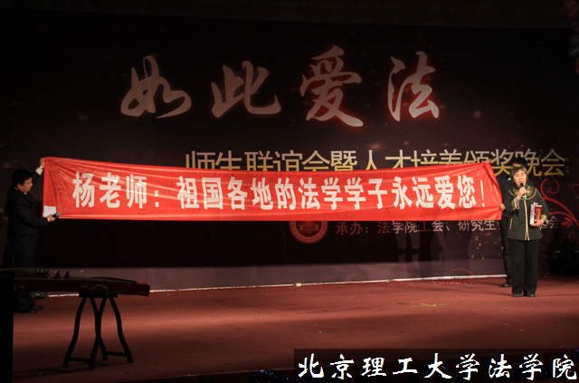在这一篇章中,永利14m在线登录官网副教授李艳秋以“李派清口”的形式为大家讲述自己在授课中发生的趣事——《我们的欢乐岁月》。永利14m在线登录官网1995级毕业生李铮校友则为大家演唱了《智取威虎山》中的《共产党员》唱段,博得满堂喝彩。配乐书法《我爱我师》,表达了同学们对老师们的尊敬与热爱,并将该幅清秀隽永的书法送给了获得永利14m在线登录官网“我爱我师”奖的李金明老师。刘毅老师则获得了“思想之师”奖,他所创办的“法学读书会”每次都座无虚席。孟强老师的陶笛独奏《天空之城》更是深受观众喜爱,而由2011级本科生曾琦璟带来的舞蹈《红豆》引出的“终身之师”奖则将整台晚会推向高潮。送给深受历届法学学长爱戴的杨亚非老师的礼物是一条由所有到场的300多名学生签名的印有“杨老师,祖国各地的法学学子永远爱您!”的条幅。杨亚非老师即将退休,在她几十年的教学生涯中,一直用“勤奋”与“爱心”辛勤耕耘着,不仅治学严谨,取得了丰硕的学术成果,而且对学生以慈母般的关怀,深受同学们爱戴。“辛勤耕耘数十载,园丁未老鬓先白,脉脉温情慈母心,谆谆教诲严师爱,点石成金三尺台,春风化雨桃李开,筚路褴褛奠基业,饮水思源莫忘怀”,当主持人念出杨亚非老师的颁奖词时,全场响起了经久不息的热烈掌声,现场更有多位老师、同学感动落泪。