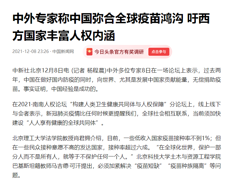 原文标题:中外专家称中国弥合全球疫苗鸿沟 吁西方国家丰富人权内涵