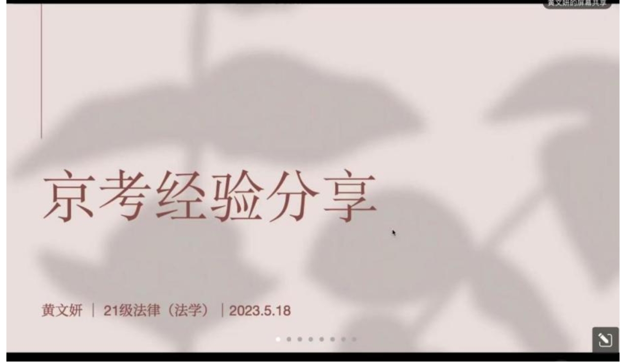 第五位分享人是黄文妍,现已考入北京市某基层人民法院。黄文妍主要从考试与选岗、笔试备考、面试准备以及心态调整四个方面分享经验。第一,黄文妍介绍了有关国考、京考、京选以及各地省考的报名时间以及笔试时间,强调要及时关注放岗信息。第二,黄文妍强调笔试备考的三大阶段:听课为主,刷题为辅;大量刷题,提升正确率;利用套卷和刷题组,提升答题速度,找到自己的节奏。第三,黄文妍指出在备考面试的过程中一定要多开口,对镜练习,多积累。最后,黄文妍强调备考过程中要保持心态平稳,良好的心态是“上岸”的关键。