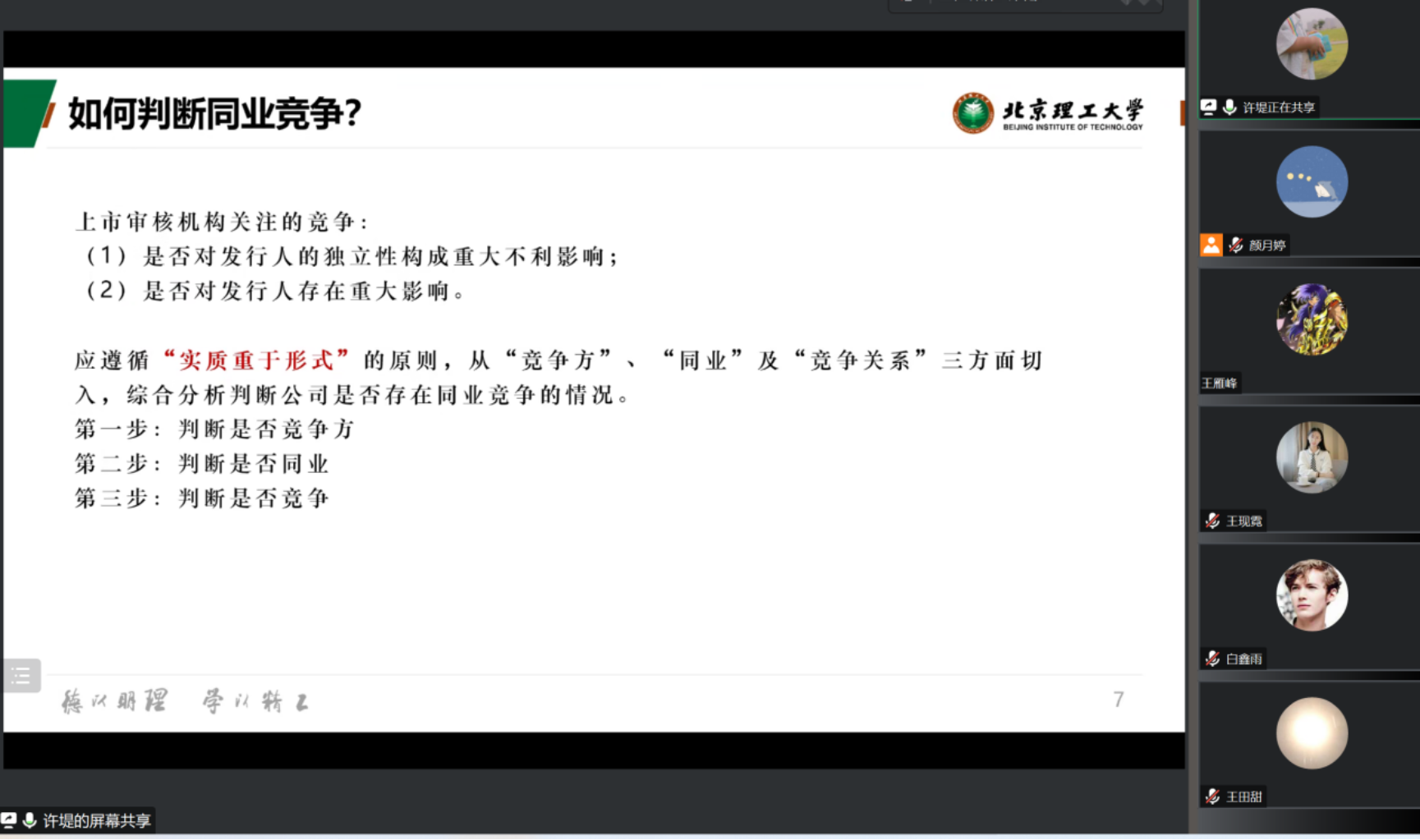 2022级法律硕士许堤同学就“同业竞争”这一专题进行了分享,对同业竞争的定义、限制同业竞争的原因、同业竞争的判断方式、现有制度的问题和改革趋势等方面进行了分析。在分享研究心得时,她先指出了同业竞争的实质是商业机会分配的利益冲突,以及公司的组织性与独立性之间的矛盾。同业竞争会减损上市公司的独立性,影响经营效果的真实性与竞争的公平性,损害中小股东的利益,因此要限制同业竞争。接着,她介绍了在判断是否构成同业竞争时,应遵循“实质重于形式”的原则,从“竞争方”、“同业”及“竞争关系”三方面切入,综合分析判断。最后,她介绍了在我国国企改制背景中,核准制下对同业竞争采取刚性禁止。随着核准制到注册制的改革,同业竞争的审查也出现了变化,在注册制改革中,应当以信息披露为中心并强化信息披露中的风险揭示,限缩范围并分类弹性处理,部分放宽对同业竞争的监管要求。