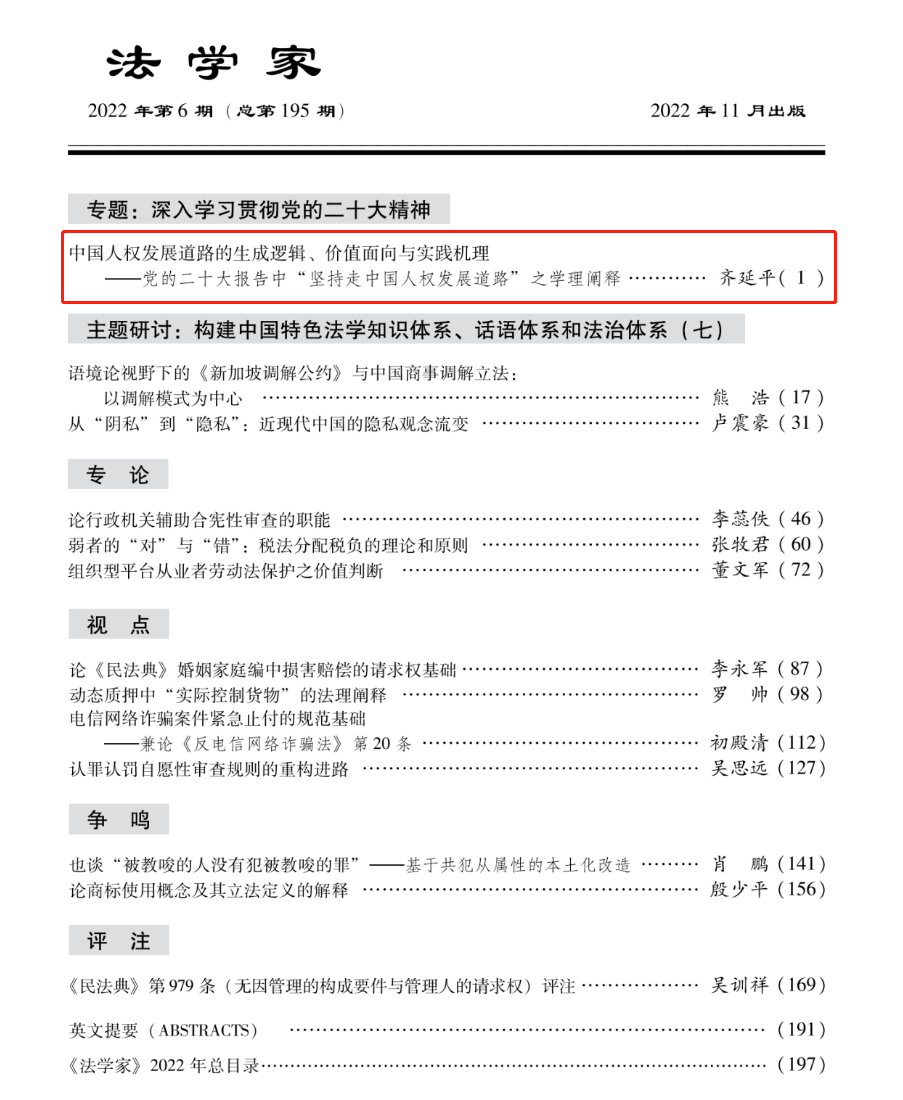中国人权发展道路的生成逻辑、价值面向与实践机理——党的二十大报告中“坚持走中国人权发展道路”之学理阐释,法学家,2022(06)