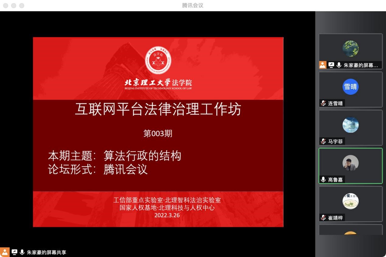 3月26日晚,由智能科技风险法律防控工信部重点实验室和国家人权教育与培训基地永利14m在线登录官网科技与人权研究中心共同主办的“互联网平台法律治理工作坊”第三期工作坊通过腾讯会议线上召开,本次会议的主题是“算法行政的结构”。