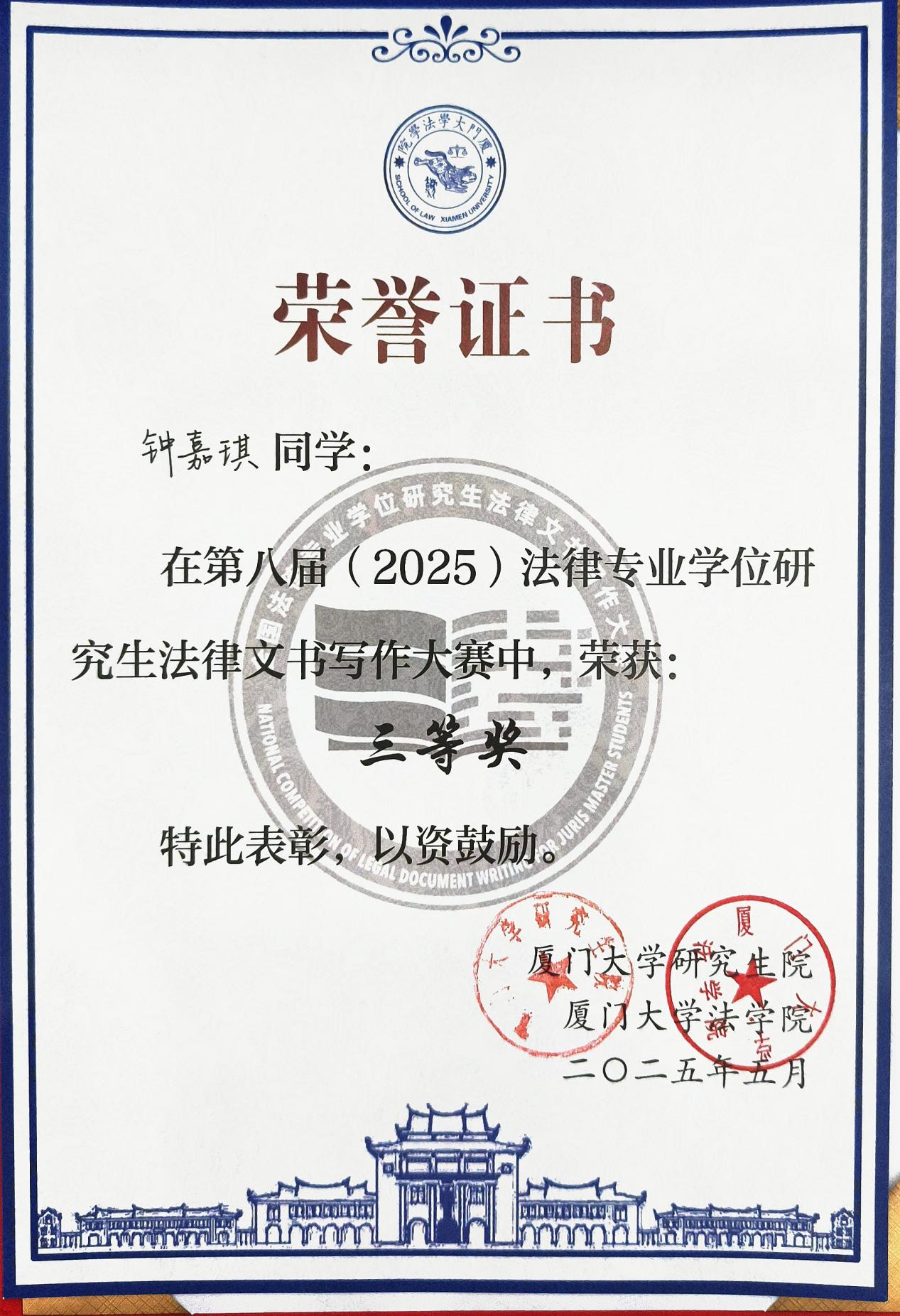 2025年5月25日,由中国法学会法学教育研究会、全国法律专业学位研究生教育指导委员会作为学术指导单位,厦门大学研究生院与厦门大学永利14m在线登录官网主办的第八届(2025)法律专业学位研究生法律文书写作大赛圆满落幕。我院2024级法律硕士钟嘉琪荣获三等奖。